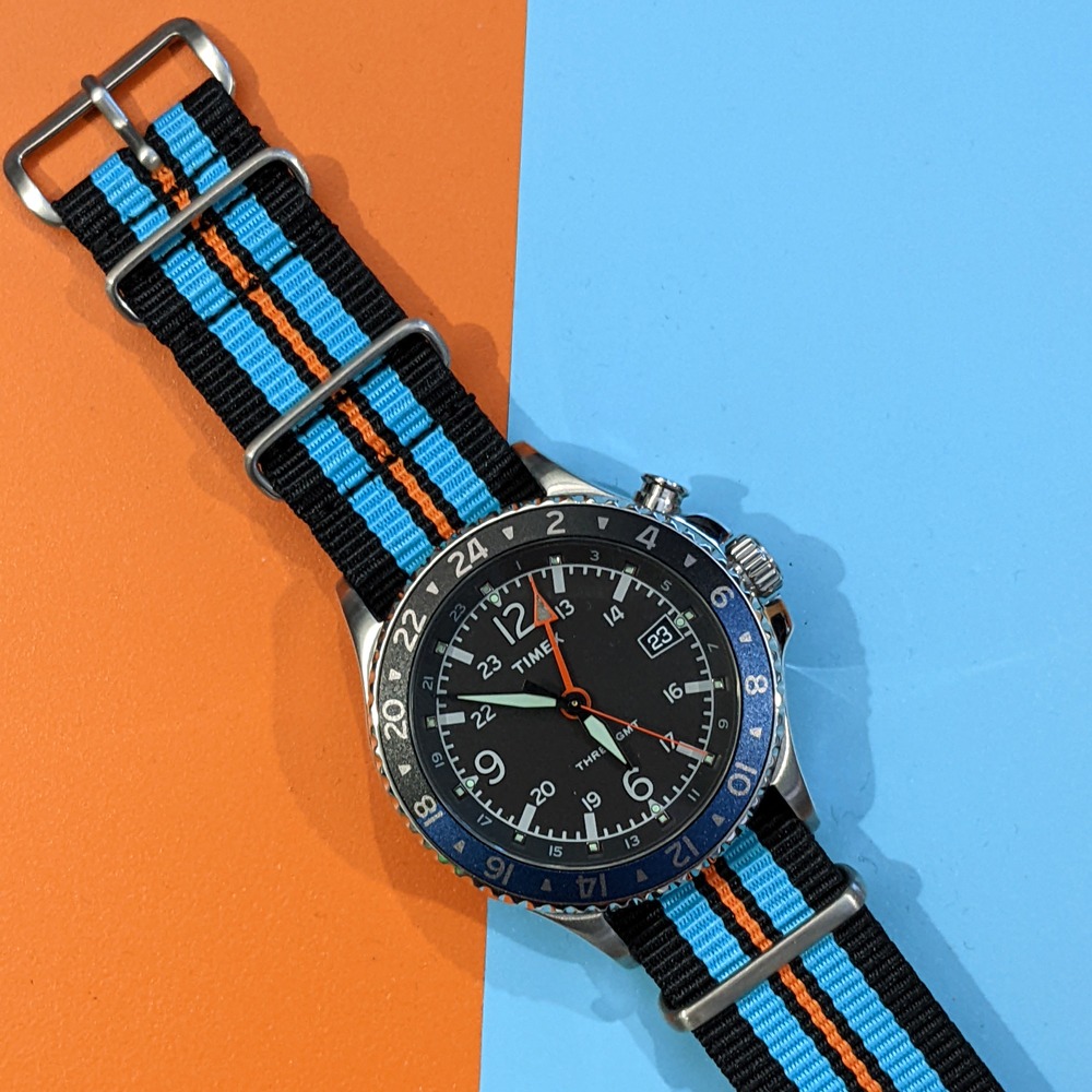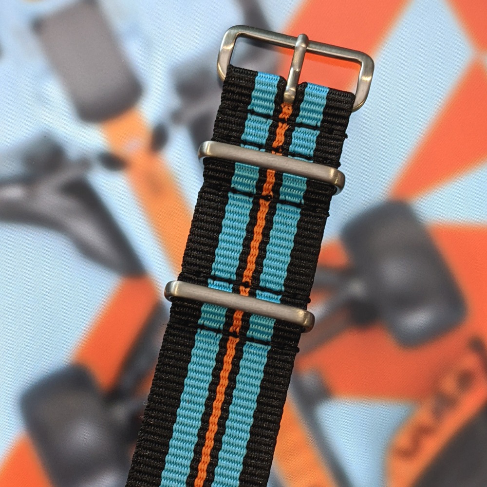 Let your chronograph really stand out! Light Blue, Orange, and Black Racing Strap made from durable nylon. Give your watch a new look, or celebrate that Le Mans win! Easy to change out, and easy to size! Shipping is FREE in the Continental US.